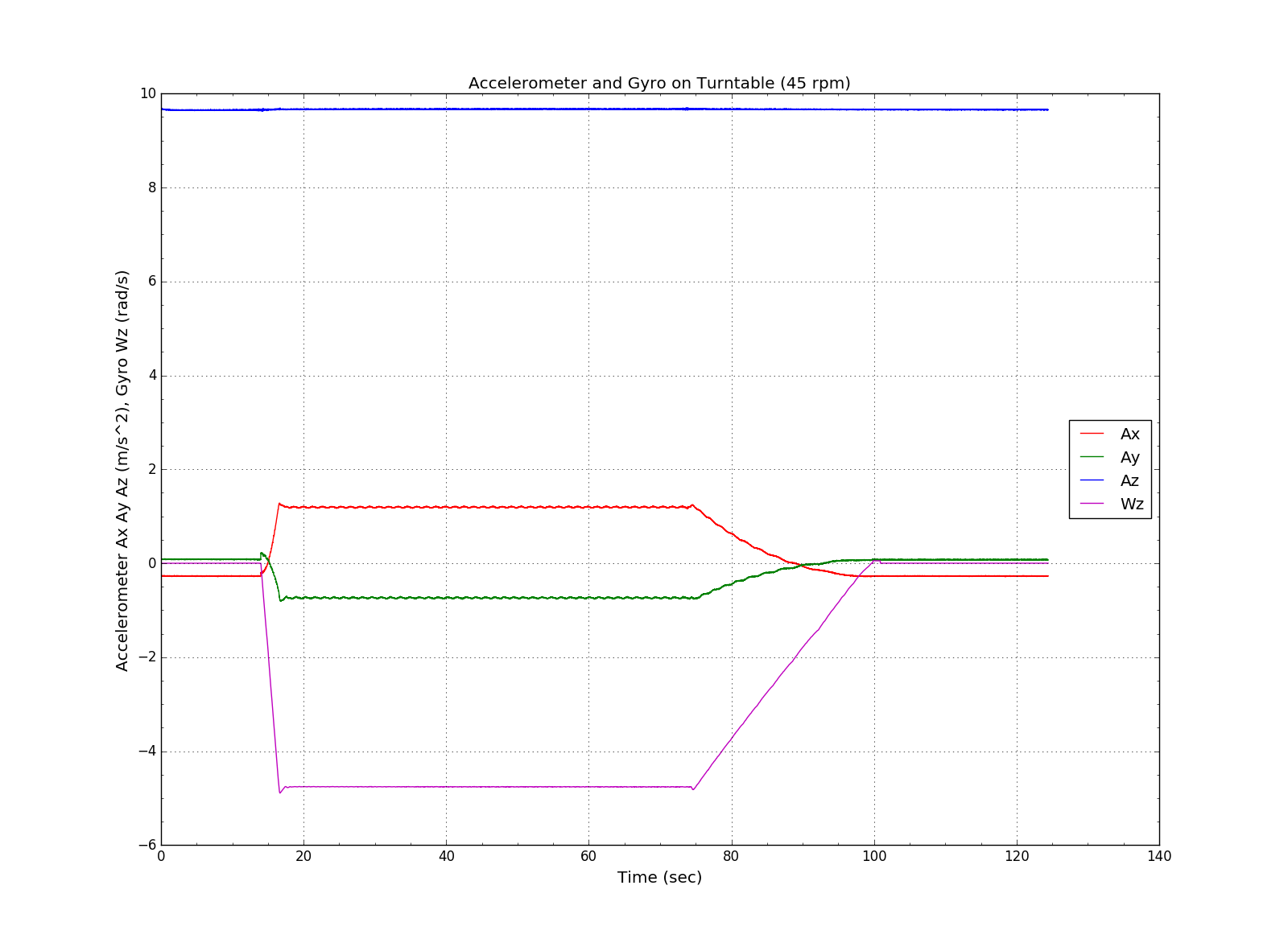 Finding accelerometer location inside a phone - Haversin - 01-18-2020 I hope this experiment has not already been discussed. It's finding the location of the accelerometer inside a phone by placing the phone on a turntable and recording the accelerometer readings while the turntable is rotating. Combined with the phones position relative to the spindle (rotation center) and the turntable rotation speed, the location of the accelerometer can be calculated. To simply the calculations the middle right side of the phone was placed adjacent to the spindle with the z axis pointing up. The first plot shows a run with accelerometer and gyro Wz data recorded. It's noted that the accelerometer Ax and Ay show bias terms of -0.27 and 0.085 m/s^2 respectively. The second plot shows a different run with linear acceleration and gyro Wz data recorded. The linear acceleration Ax and Ay do not show bias terms but overshoot zero as the turntable is slowing down. Both runs start with the turntable stationary then the turntable is turned on and speeds up to 45 RPM. The turntable is then turned off and slows down to a stop. RE: Finding accelerometer location inside a phone - Haversin - 01-22-2020 Here are some accelerometer position results from the data shown previously. First the geometry and calculation of accelerometer position is shown below. Photo of the actual setup. Alignment of the phone x axis and turntable x axis is done by placing the center of the phone's right side against the spindle. The position calculated using accelerometer, accelerometer minus bias and linear acceleration data did not agree so an alternative method of measuring accelerometer position was used for comparison. This other method I'm calling the “null method” and involves varying the phones position on the turntable until the Ax and Ay readings go to zero while the turntable rotates. Because the spindle is in the way for free positioning of the phone, the phone is placed on a small platform above the spindle. The null method setup is shown here. The remote control feature of Phyphox came in very handy for this because I could start recording data after the turntable got up to full speed. With no startup transients on the graphs the scale of the plots remained small and I could clearly see the mean of Ax and Ay getting close to null. Once null was established a felt marking pen was used to trace circles on the glass cover of the phone. These marked circles allow the center of rotation and hence the accelerometer position to be measured. Here is the accelerometer minus bias null position. A table of the results. The largest difference between the calculated position and the null position was seen in the linear acceleration with 1.6 cm, accelerometer was 3 mm and accelerometer minus bias was about 2 mm. Of course these results will probably vary with the type of phone. RE: Finding accelerometer location inside a phone - Physikator - 01-23-2020 This should be included in the "sensor database experiment" :-) My approach would have been to measure the distance of the sensor to the axis using the "centripetal force" experiment several times at different orientations relative to the spindle and then finding the intersection of the resulting circles. Unfortunately I don't have a turntable. RE: Finding accelerometer location inside a phone - Haversin - 01-24-2020 (01-23-2020, 09:03 PM)Physikator Wrote: My approach would have been to measure the distance of the sensor to the axis using the "centripetal force" experiment several times at different orientations relative to the spindle and then finding the intersection of the resulting circles.I like this idea, it's sounds like a 2 D version of how GPS works. For the first position/orientation I'd use middle right side of phone against the spindle (same as above). For the second I tried the middle top of the phone against the spindle and when I turned on the turntable the end of the phone hit the tone arm support no damage done I will need to use a platform to rise the phone above the tone arm support.