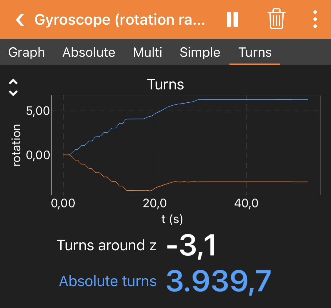 Children don't understand much rotation speeds in rad/s in the raw data of the gyroscope. So I add "turns" where they can see a number of turns (signed - positive left and negative right and absolute). The smartphone should be kept horizontally while turning Angel ...