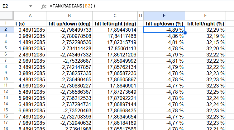 An inclination in % is equivalent to a deviation of x meter in vertical / y meter in horizontal. For example, 45° is 100%. So far the workaround is to export in a spreadsheet and convert each values using formula =TAN(RADIANS(B2)) but it's not real-time.
