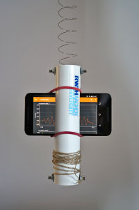 Attach the mount to the spring and let it oscillate. The best way to do this is by pulling down the phone a little and let it go. This way you avoid that the phone hits the floor - just do not move it down so much that it overshoots... Finally, while already oscillating, start the experiment to determine the oscillation frequency and period.